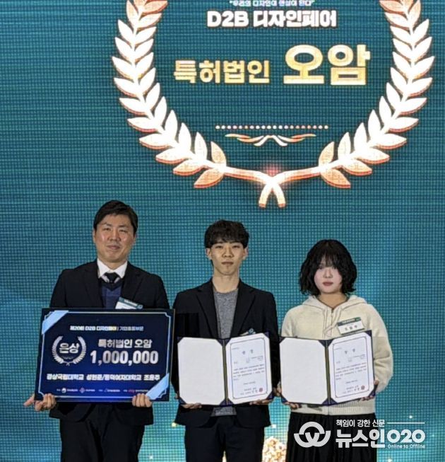 (뉴스인020 = 김성길 기자) 경상국립대학교 지식재산융합학과 대학원 성현준 팀이 12월 3일 서울 삼성동 코엑스에서 개최된 ‘2025 D2B 디자인페어’에서 은상을 수상했다.