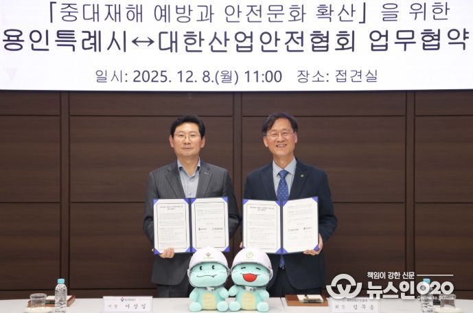 (뉴스인020 = 김성길 기자) 용인특례시는 8일 시청 4층 접견실에서 대한산업안전협회와 ‘중대재해 예방과 안전문화 확산을 위한 업무협약’을 맺었다.