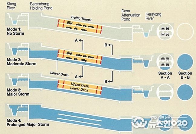 말레이시아 정부는 비가 오면 수시로 넘쳤던 클랑강 범람을 막고 평상시에는 쿠알라룸푸르 시내 교통 정체를 해소하기 위해 2007년 복합터널 ‘SMART’를 건설했다. 일정 강우량 이상 비가 내리면 차량 통행을 통제하고 하천 유량을 조절하는 통로로 사용한다.