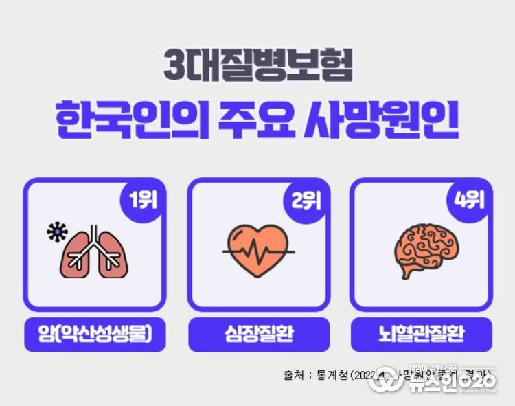 (뉴스인020 = 김성길 기자) 흔히 3대질병이라 일컫는 암, 심혈관질환, 뇌혈관질환은 통계청 발표자료에 따르면 한국인의 주요 사망원인 중에서 3위 폐렴을 제외하고 1~4위를 차지하고 있으며, 이전부터 지금까지도 살면서 가장 먼저 대비해야 하는 치명적인 질병으로 강조되고 있다. 이러한 중대질병에 대비하기 위하여 상기 세가지 치명적인 질병을 집중보장하는 3대질병진단비보험을 많이 가입하고 있다. 3대진단비보험은 각각의 질병을 중점적으로 보장하면서도 가입자 특성에 맞는 특약을 추가함으로써 종합건강보험으로도 활용할 수가 있다.