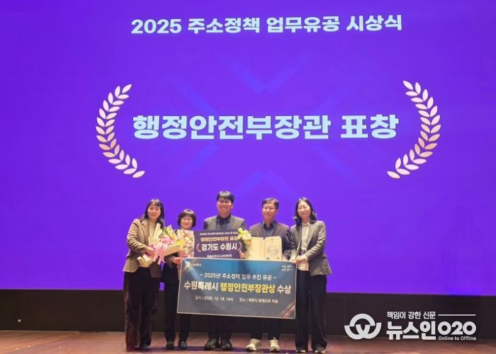 (뉴스인020 = 기자) 수원특례시가 행정안전부 주관 ‘2025 주소정책 워크숍’에서 ‘2025 주소정책 업무 분야 우수기관’으로 선정돼 행정안전부 장관 표창을 받았다. 특별교부세 4000만 원도 확보했다.