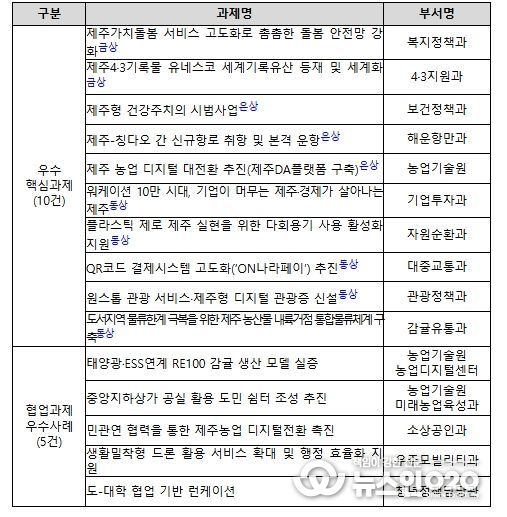 이 가운데 상위 5개 과제가 이날 발표 심사를 거쳐 최종 순위를 가렸으며, ‘제주4·3기록물 유네스코 세계기록유산 등재 및 세계화’와 ‘제주가치돌봄 서비스 고도화로 촘촘한 돌봄 안전망 강화’ 과제가 금상을 차지했다.