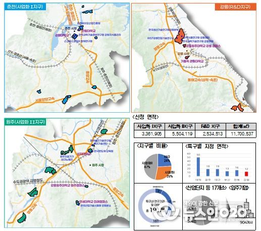 다만 춘천·원주·강릉 개별 도시 단위로는 여전히 지정 요건 충족에 한계가 있었던 만큼 도는 중앙정부와의 협의 과정을 통해 3대 도시의 연구·산업 역량을 하나로 결집하는 연합형 연구개발특구 모델을 제안했으며 그 결과 이번 신규 지정에 이르게 됐다.