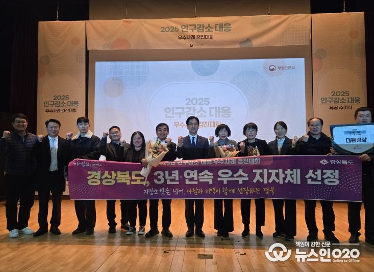 (뉴스인020 = 김성길 기자) 경상북도가 행정안전부 주관 ‘2025년 인구감소대응 우수사례 경진대회’에서 지역 기반 이민정책으로 대통령상을 받으며, 3년 연속 인구 감소 대응 우수기관으로 선정됐다.
