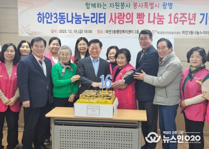 (뉴스인020 = 김성길 기자) 광명시 하안3동 나눔누리터는 광명시자원봉사센터, 하안3동 행정복지센터와 함께 지난 19일 하안3동 행정복지센터 2층 회의실에서 ‘사랑의 빵 나눔’ 16주년 기념식을 개최했다.