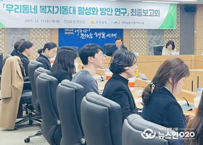 (뉴스인020 = 김성길 기자) 전라남도는 ‘우리동네 복지기동대 활성화 방안 연구용역 최종보고회’를 열어 복지기동대의 운영 고도화 방안과 지속 가능한 발전 방향을 논의했다.