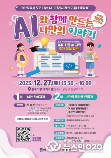 (뉴스인020 = 김성길 기자) 충청북도는 오는 12월 27일 13:30 충북도청 대회의실에서 도내 초등학생(3~6학년)과 학부모 200여명을 대상으로 ‘AI 웹툰 교육(중부권 2차)’을 진행한다고 밝혔다. 이번 교육은 북부권(충주), 남부권(옥천), 중부권 1차(청주)에 이어 2025년 마지막으로 개최되는 도내 AI 창작 체험 프로그램이다.