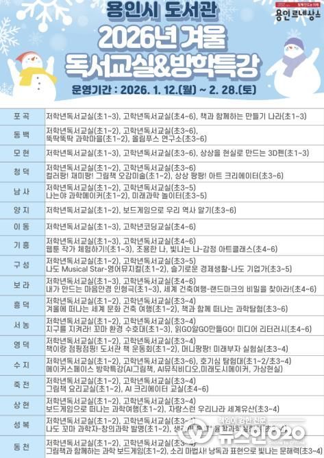 (뉴스인020 = 김성길 기자) 용인특례시는 내년 1월 12일부터 2월 28일까지 도서관에서 겨울 독서 교실과 방학 특강을 운영한다고 밝혔다.