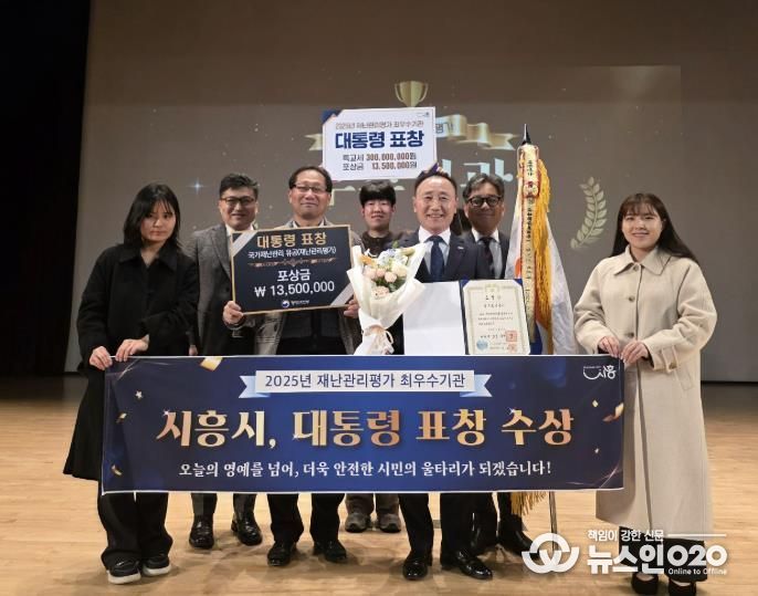 (뉴스인020 = 김성길 기자) 시흥시는 행정안전부가 주관한 ‘2025년 재난관리평가’에서 최우수기관으로 선정돼 지난 12월 22일 정부세종청사 국토교통부 대강당에서 열린 시상식에서 대통령 표창을 받고 특별교부세 3억 원과 포상금 1,350만 원을 확보했다.
