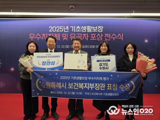 (뉴스인020 = 기자) 수원특례시가 보건복지부 주관 ‘2025년 기초생활보장·긴급지원 사업’ 평가에서 우수 지자체로 선정돼 보건복지부 장관 표창을 받았다. 시상식은 22일 서울 글래드호텔에서 열렸다.