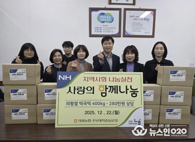 (뉴스인020 = 김성길 기자) 의왕농협 주부대학총동문회는 12월 22일, 회원들의 뜻을 모아 떡국떡 400kg(280만원 상당)을 부곡동주민센터에 기탁하며 어려운 이웃을 위한 나눔을 실천했다.