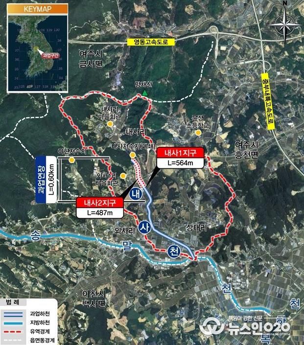 정비사업은 여주시 흥천면 내사리 일원 총 연장 0.6km 구간의 하천을 정비(하폭 6~14 → 15~20m)하는 것으로 ▲축제공(제방 쌓기) 1.05km ▲교량 3개 설치 등이 포함된다.