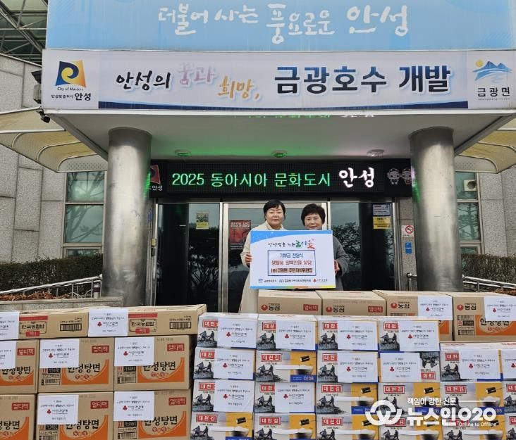 (뉴스인020 = 김성길 기자) 안성시는 12월 23일, 금광면 주민자치위원회 양영순 위원장이 겨울철 취약계층 가구의 따뜻한 겨울나기를 돕기 위해 라면, 김 등 생필품 100만원 상당을 금광면 행정복지센터에 기탁했다고 밝혔다.