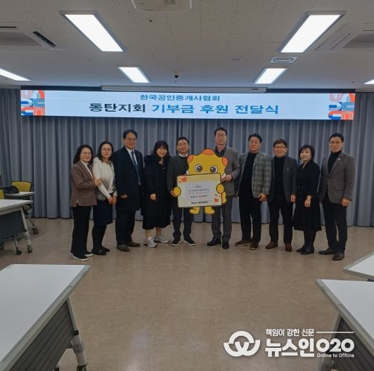 (뉴스인020 = 김성길 기자) 화성특례시는 한국공인중개사협회 화성동탄지회(초록·중앙·리베라·호수·청계회 포함)에서 24일 화성시 동탄출장소를 방문해 어려운 이웃을 돕기 위한 기부금 619만 원을 기탁했다고 밝혔다.