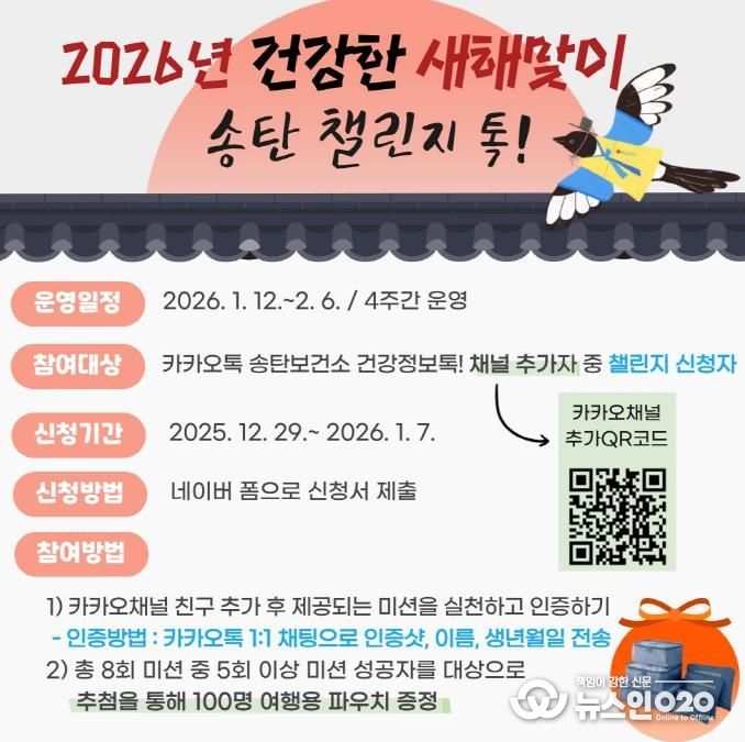 (뉴스인020 = 김성길 기자) 평택시 송탄보건소는 12월 29일부터 2026년 1월 7일까지 건강한 새해맞이 ‘송탄 챌린지 톡!’1차 참여자를 모집한다고 밝혔다.