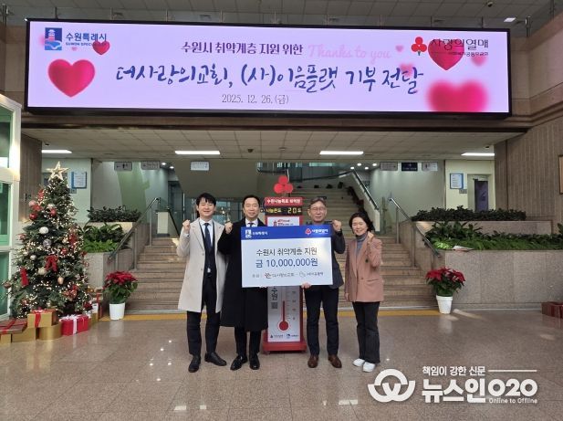 (뉴스인020 = 기자) 더사랑의교회가 설립한 사회복지법인 ‘이음플랫’이 “취약계층 지원을 위해 사용해달라”며 26일 1000만 원을 수원시에 기부했다. 기부금은 사회복지공동모금회에 지정기탁 방식으로 수원시 취약계층 지원에 사용할 예정이다.