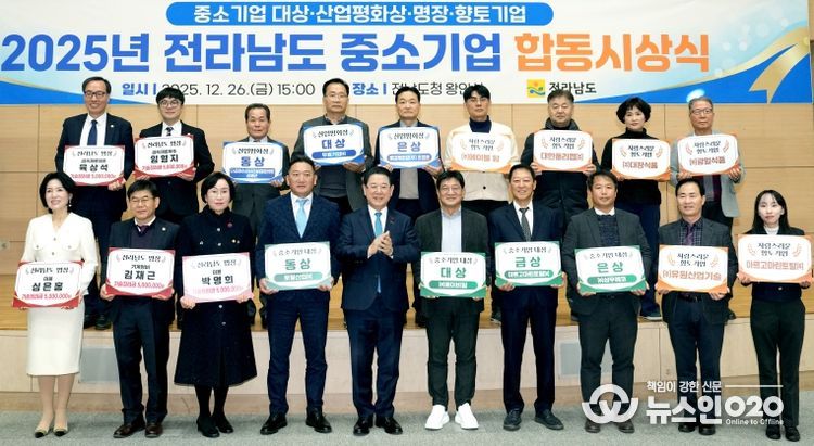 (뉴스인020 = 김성길 기자) 전라남도는 26일 중소기업의 성장과 산업현장 숙련기술인의 공로를 기리기 위해 ‘2025 중소기업 합동 시상식’을 열고 기업경영·노사화합·숙련기술 등 각 분야에서 우수한 성과를 거둔 기업과 개인을 시상했다.