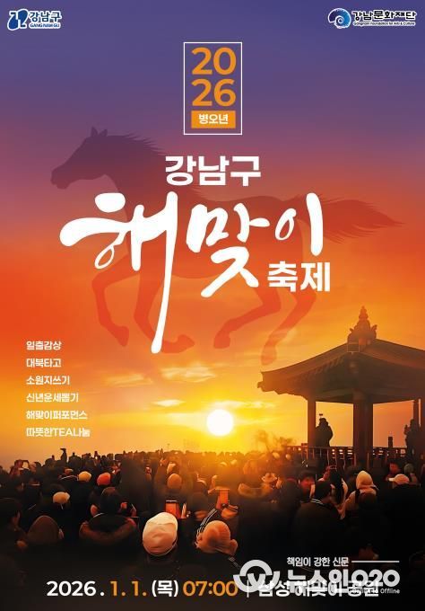 (뉴스인020 = 김성길 기자) 꿈이 모이는 도시, 미래를 그리는 강남구가 강남문화재단과 함께 2026년 1월 1일 오전 7시, 삼성해맞이공원에서 구민과 함께하는 ‘2026 새해 해맞이 행사’를 개최한다.