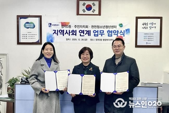 (뉴스인020 = 기자) 수원시 장안구 정자3동 행정복지센터 및 주민자치회는 지난 26일 지역 내 청소년‧청년 전문 기관과 협력하여 주민에게 양질의 프로그램을 제공하고 주민자치센터 프로그램 운영을 활성화하기 위해 지역사회 연계 업무협약을 체결했다.