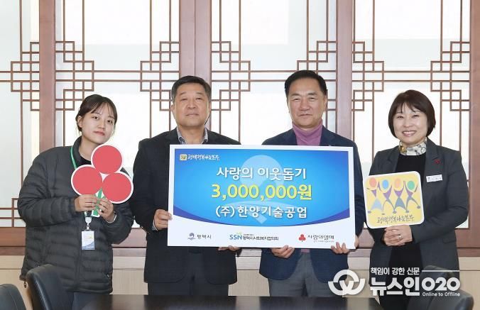 이에 정장선 평택시장은 “우리 사회 어려운 분들을 생각하며 후원하신 ㈜한양기술공업에 감사드린다”며 “지역사회 나눔 실천에 진심으로 감사드린다”고 전했다.