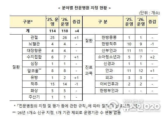 제5기 3차년도 전문병원 지정에 따라, 2025년 114개에서 2026년에는 118개 전문병원을 지정·운영하게 된다.
