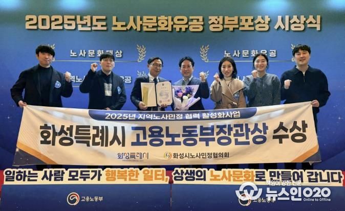 (뉴스인020 = 김성길 기자) 화성특례시는 지난 30일 고용노동부 주관으로 열린 '2025년 노사문화유공 정부포상 시상식’에서 ‘지역노사민정 협력 유공’단체부문 고용노동부장관 표창을 수상했다고 31일 밝혔다.