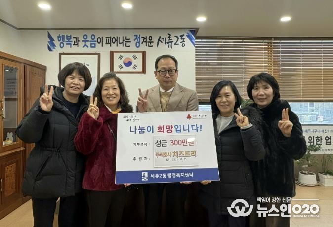 (뉴스인020 = 기자) 지난 31일, 수원시 권선구 세류동에 소재한 ㈜치즈트리는 이웃사랑 성금 300만 원을 세류2동 행정복지센터에 후원했다.