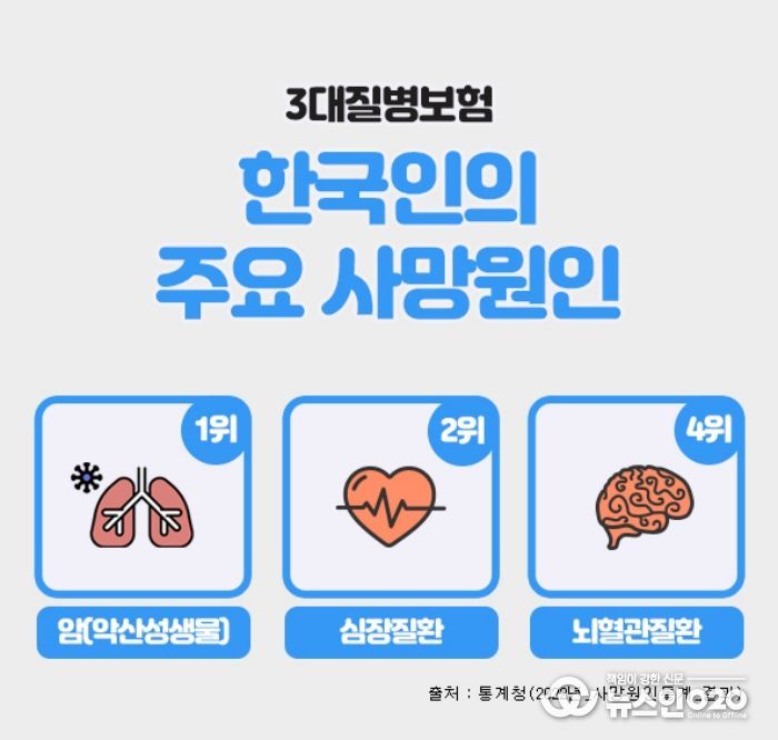 (뉴스인020 = 김성길 기자) 3대질병으로 일컬어지는 암, 뇌혈관질환, 심혈관질환은 한국인의 주요 사망원인에서 상위를 차지하고 있으며, 이에 대한 진단비를 집중적으로 보장해 주는 보험상품을 3대질병진단비 보험이라 할 수 있다.
