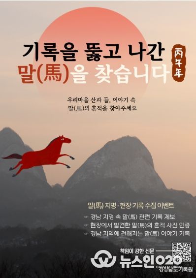 (뉴스인020 = 김성길 기자) 경상남도기록원은 2026년 붉은 말(馬)의 해를 맞아 도민이 일상 속에서 발견한 말(馬) 관련 지명과 지역의 흔적, 개인의 기억을 기록으로 남기는 도민 참여형 기록 이벤트'기록을 뚫고 나간 말을 찾습니다'를 추진한다고 밝혔다.