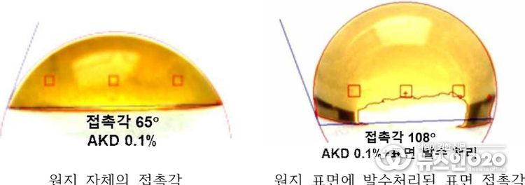 연구팀과 케이엔에스케미칼, 에스엘팩연구소가 공동 개발한 기술은 원지에 투입하는 AKD를 공정에 필요한 최소 수준으로 줄이는 대신, 종이 표면에 발수제를 단독 혹은 전분과 혼합해 도포하는 ‘표면 발수 처리(surface hydrophobization)’ 방식이다.