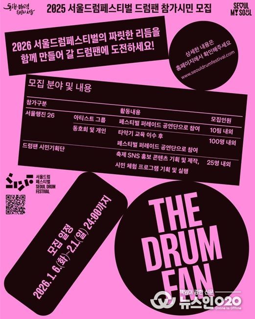 (뉴스인020 = 김성길 기자) 서울시는 오는 5월 동대문디자인플라자(DDP)에서 개최되는 ‘2026 서울드럼페스티벌’을 앞두고 축제의 주인공으로 활약할 ‘드럼팬(Drum Fan)’ 시민 참여자를 2월 1일까지 모집한다. 올해 축제는 단순 관람을 넘어 시민이 직접 기획하고 참여하는 ‘시민 주도형’ 축제가 될 것으로 기대된다.