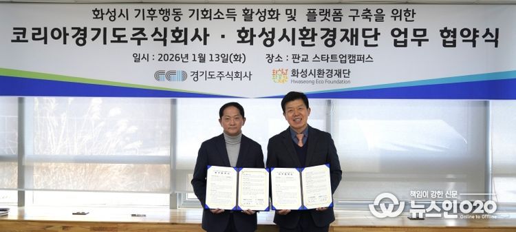 (뉴스인020 = 김성길 기자) 경기도주식회사는 13일 경기도 성남시 판교 스타트업캠퍼스에서 화성시환경재단과 ‘기후행동 기회소득 활성화 및 화성시 플랫폼 구축을 위한 업무협약’을 체결했다.