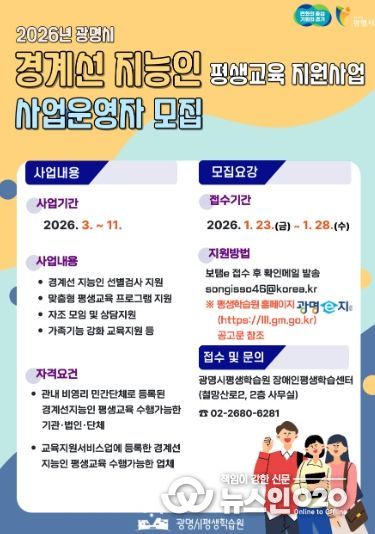 (뉴스인020 = 김성길 기자) 광명시는 ‘2026년 광명시 경계선지능인 평생교육 운영 지원사업’을 수행할 보조사업자를 오는 28일까지 공개 모집한다.