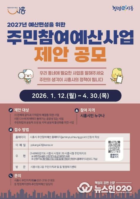 (뉴스인020 = 김성길 기자) 시흥시는 오는 4월 30일까지 주민들이 직접 사업을 제안하는 ‘시흥시 주민참여예산 제안’을 신청받는다.