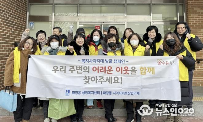 장인영 파장동장은 “이번 캠페인을 통해 지역 내 복지사각지대 대상자를 발굴하고 주민과 함께 복지 안전망를 강화하는 계기가 됐다”며 “앞으로도 현장 중심의 복지사각지대 발굴 활동을 지속적으로 추진하겠다”고 말했다.