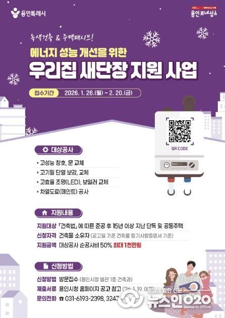 (뉴스인020 = 김성길 기자) 용인특례시가 오는 26일부터 2월 20일까지 노후주택 에너지 효율 개선 지원 사업인 ‘우리집 새단장 지원사업’ 신청을 받는다고 16일 밝혔다.