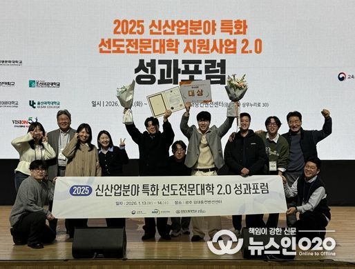 (뉴스인020 = 김성길 기자) 강원도립대학교는 ‘신산업분야 특화 선도전문대학 지원사업 2.0 성과포럼’ 우수성과 전시 시상식에서 대학 부문 우수성과 ‘대상’ 수상과 함께, 소속 학생인 한재민 학생이 개인 부문 사업 성과 대상(교육부 장관상)을 수상하여 대학·개인 2개 부문을 석권했다.