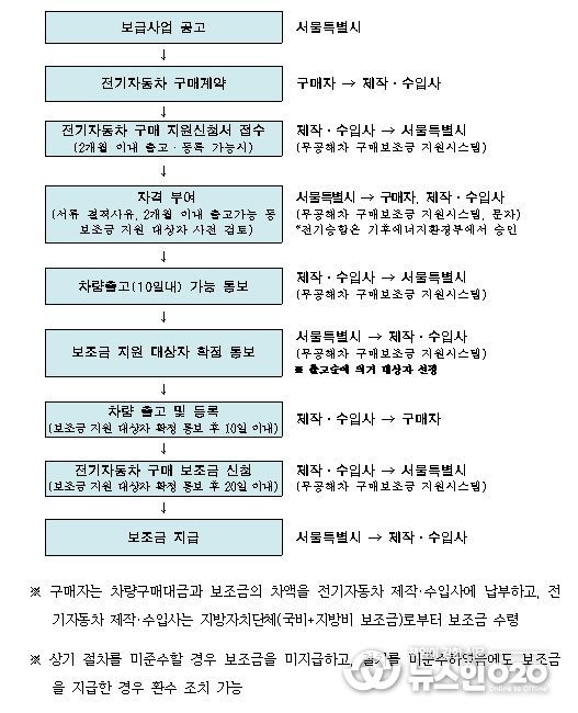 구매희망자는 자동차 제작·수입사와 계약을 체결하고, 제작·수입사가 서울시에 보조금을 신청하면 출고·등록 순으로 지원 대상자가 선정된다. 보조금은 차량 출고 및 등록 후 서울시가 제작·수입사에 직접 지급하며, 구매자는 보조금을 제외한 금액만 납부하면 된다.
