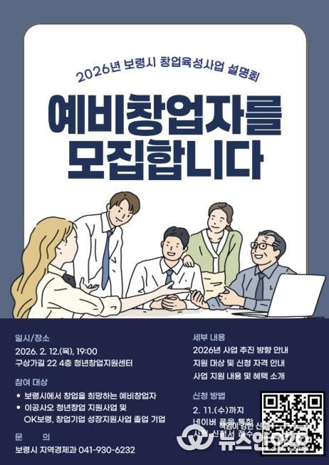 (뉴스인020 = 김성길 기자) 보령시는 오는 2월 12일 오후 7시 청년창업지원센터에서 예비창업자 및 창업기업을 대상으로 ‘2026년 창업육성사업 설명회’를 개최한다.