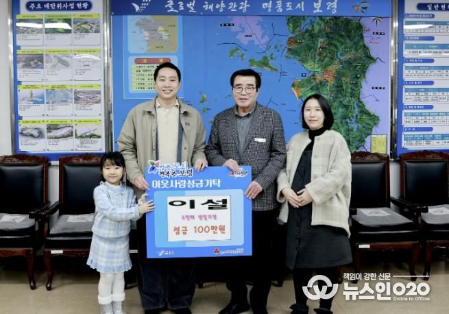 (뉴스인020 = 김성길 기자) 보령시는 지난 20일 시장실에서 이지원 씨와 배우자 고가슬 씨, 그리고 딸 이설 양이 참석한 가운데 ‘희망 나눔 캠페인’ 성금 전달식을 가졌다. 이날 이 씨 가족은 이설 양의 생일을 기념해 정성껏 마련한 성금 100만 원을 보령시에 기탁했다.