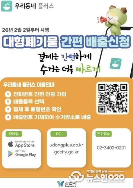 (뉴스인020 = 김성길 기자) 과천시는 시민 편의를 높이기 위해 오는 2월 2일부터 대형폐기물 온라인·모바일 배출 시스템을 본격 운영한다고 밝혔다.