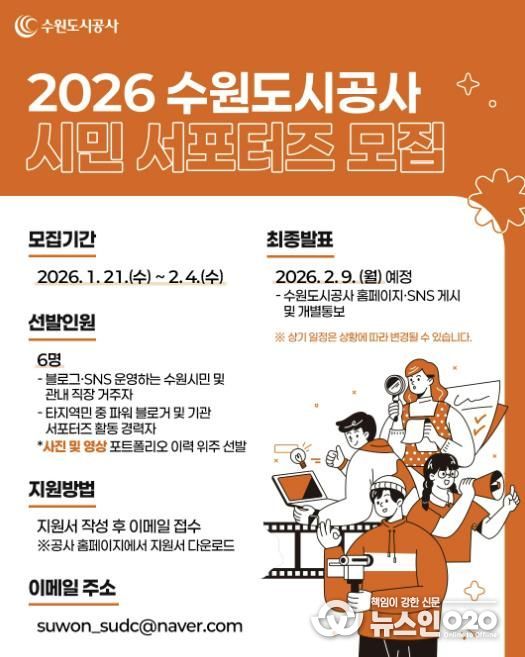 (뉴스인020 = 기자) 수원도시공사가 21일부터 다음 달 4일까지 2026년도 제8기 시민 서포터즈를 모집한다.