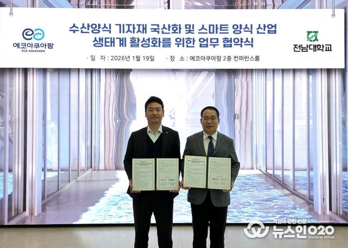 (뉴스인020 = 김성길 기자) 전남대학교 스마트수산양식연구센터(센터장 김태호 교수)가 에코아쿠아팜(주)와 스마트양식 분야 기술협력 및 인력양성 강화를 위한 업무협약을 체결했다. 업무협약식은 19일 부산 에코아쿠아팜(주) 2층 컨퍼런스 홀에서 진행됐다.