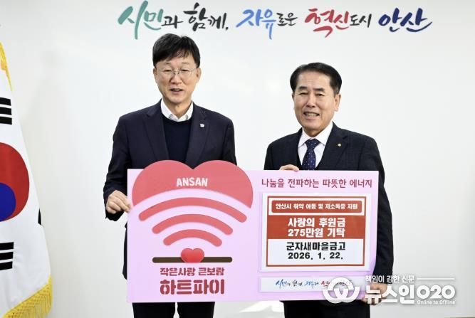(뉴스인020 = 김성길 기자) 안산시는 지난 22일 군자새마을금고로부터 사랑의 후원금 275만 원을 기탁받았다고 23일 밝혔다.