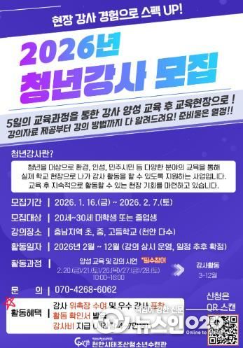 (뉴스인020 = 김성길 기자) (재)천안시청소년재단 천안시태조산청소년수련관이 2월 7일까지 ‘2026년 청년강사 양성 사업’ 참여자를 모집한다.