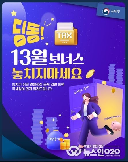 (뉴스인020 = 김나현 기자) 놓치기 쉬운 연말정산 공제 감면 혜택 국세청이 먼저 알려드립니다.
