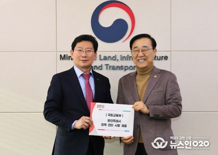 (뉴스인020 = 김성길 기자) 이상일 용인특례시장은 26일 정부세종청사에서 김윤덕 국토교통부 장관에게 ‘용인 첨단시스템반도체 클러스터 국가산업단지’ 정상 추진과 경기남부광역철도 ‘제5차 국가철도망 구축계획’ 반영 등 시의 주요 현안을 설명하는 자료를 건네고 국토교통부 지원과 협조를 요청했다.