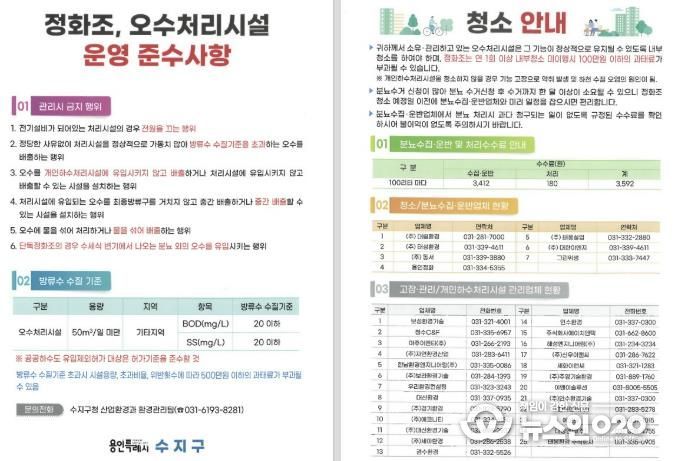 (뉴스인020 = 김성길 기자) 용인특례시 수지구는 정화조 관리 실태를 점검한 결과, 일부 시설에서 정기 청소가 제대로 이뤄지지 않는 사례가 확인됨에 따라 정화조 청소 의무 사항을 알리는 안내문을 1월 중 각 시설 소유자와 관리자에게 발송한다고 27일 밝혔다.
