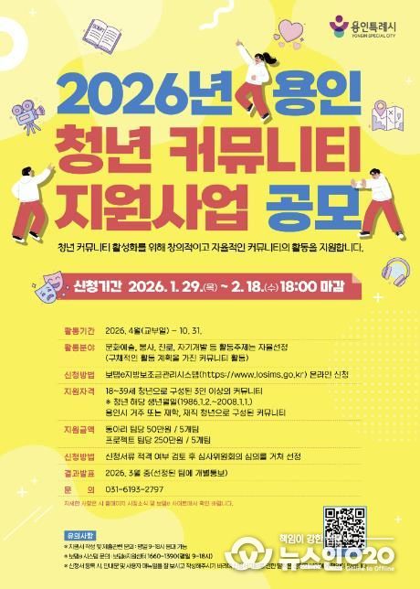 (뉴스인020 = 김성길 기자) 용인특례시는 2월 18일까지 ‘청년 커뮤니티 지원사업’에 참여할 10개 팀을 모집한다고 29일 밝혔다.