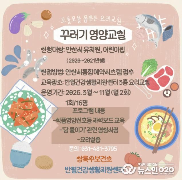 (뉴스인020 = 김성길 기자) 안산시 상록수보건소 반월건강생활지원센터는 오는 3월부터 11월까지 관내 6~7세 아동을 대상으로 ‘꾸러기 영양교실’을 운영한다고 30일 밝혔다.
